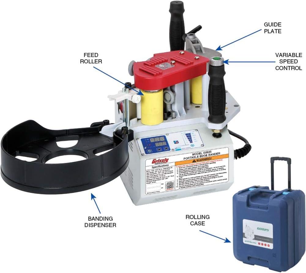 G0825 Portable Edgebander with Case and Kit A mobile edgebander to take wherever the job site may be. The G0825 Portable Edgebander is built to suit the needs of both professionals and hobbyists. Easily apply edgebanding from 3/8" to 2-1/2" wide along straight runs, around bends, and even the most difficult of all - inside corners! Perfect for on-site work or integration into your woodworking shop, because it combines the great features of a stationary edgebanding machine (hot melt glue application, speed feeding, and temperature control) with the convenience and portability of a handheld tool. The feed rate control dial adjusts the edgebanding tape feed rate between 6.5–20 FPM. The glue pot heater is designed to turn on with the press of an ON/OFF switch for safety. Conveniently, the optional T1188 Edgedanding Trimmer Router and T1189 Dual End Cutter are specially designed for this machine to ensure perfectly aligned seams and professional-looking mitered edges on all your finished work. Even better, mount the edgebander on the optional T1187 Table and you'll have the next best thing to a full-fledged stationary edgebander. The G0825 comes with a 1-year warranty which covers parts and assures the unit is free from factory defects. The G0825 manual was written by our U.S. based Technical Documentation Department and is packed with useful information. The complete and easy-to-read manual makes it easier to assemble and maintain your edgebander. The Grizzly Customer Service and Technical Support Teams are U.S. based. Parts for the edgebander are available online and shipped from the Grizzly parts warehouse in Springfield, MO. Made in an ISO 9001 factory SPECIFICATIONS: Required power supply: 15A, 110V, single-phase, 60 Hz Feed motor: 15W Feed rate: variable, 6.5–20 FPM Working temperature: Mode 1: 250°–340°, Mode 2: 175°–310° Warm-up time: 4 minutes Required surface temperature: 75°–90° Tape width: 3/8"–2-1/2" Tape thickness: 1/64"–1/8" Glue pot capacity: 13-1/2 oz. Overall size: 14" W x 12" D x 14" H Approximate shipping weight: 42 lbs. FEATURES: Works on straight and curved surfaces, including those with inside corners Easy-to-use controls with digital display and temperature control Display toggles between F° and °C Automatic glue application Variable-speed feed control on handle Removable banding holder 16' Long power cord for extra mobility Includes Table-mounting template and fixture plate