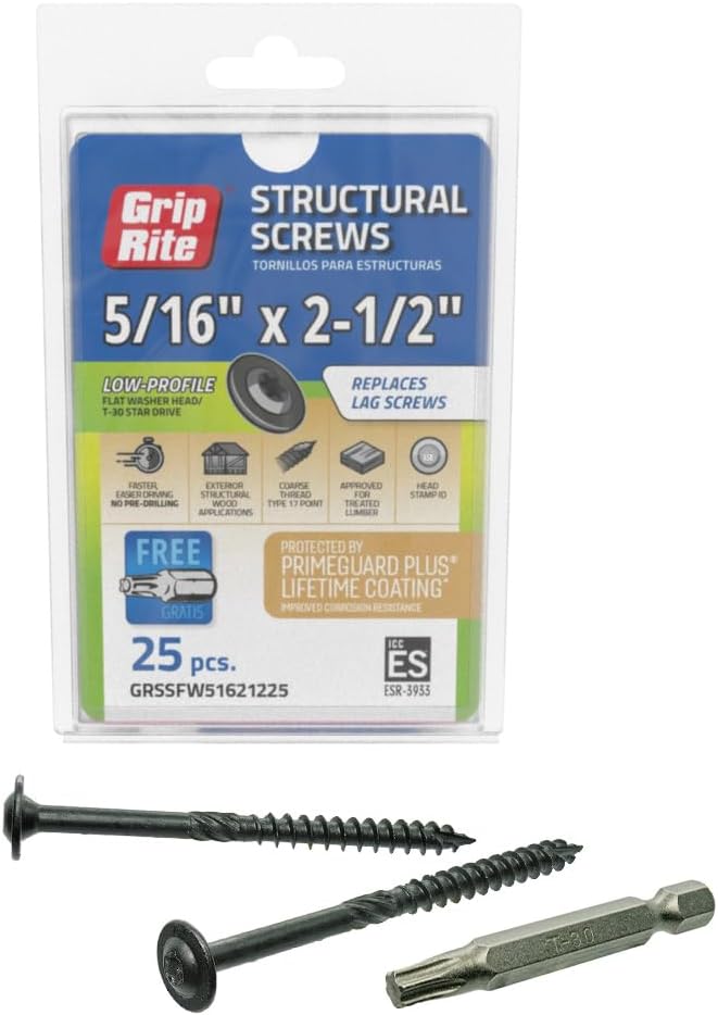 Grip-Rite® Structural Screws offer versatility, speed, and longevity in load-bearing exterior wood construction projects. Available in both traditional flat head and hex head styles, the hex head features Grip-Rite’s exclusive Dual Drive Power, which brings flexibility to the job site with a unique combined Hex Washer/Star Drive recess head, offering the user a choice of using the included hex driver or a star drive bit to fasten the screw. Both styles include an ID code stamped right into the head for easy spec reference and a load value chart conveniently located on every package. As a replacement for lag screws, Grip-Rite Structural Screws feature a type 17 point that translates to both efficiency and time savings by eliminating the need to pre-drill pilot holes. Our premium PrimeGuard Plus coating assures that Grip-Rite Structural Screws will last throughout a project’s lifetime. Easily identifiable, cobalt blue packaging features easy-to-read iconography, lateral load value references, and a scannable QR code that links directly to the ICC report for technical specifications.