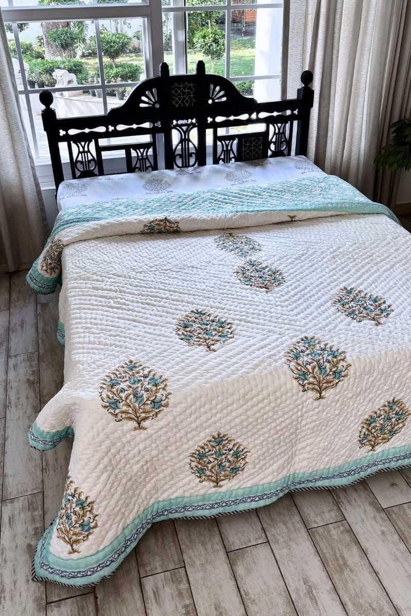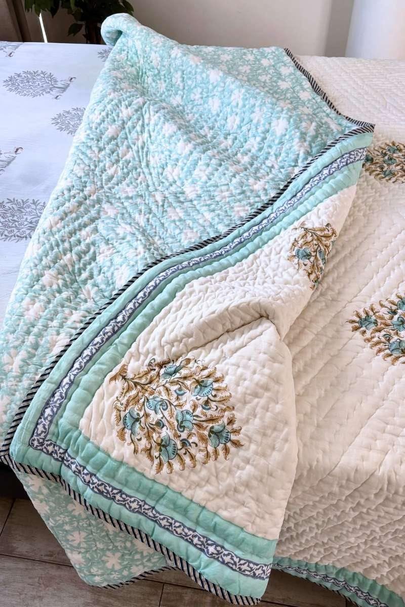 Transform your bedroom with this exquisite handcrafted cotton quilt featuring a stunning white base adorned with elegant turquoise and gold floral motifs. The traditional block-printed design showcases beautiful botanical patterns arranged in a symmetrical layout, bordered by a sophisticated turquoise trim with intricate border detailing. This lightweight quilt combines centuries-old craftsmanship with practical comfort, perfect for year-round use. The quilt's carefully layered cotton construction provides just the right amount of warmth while remaining breathable. Each piece features meticulous hand-quilting that creates a distinctive texture and ensures durability. The striking contrast between the crisp white background and the delicate turquoise accents makes this quilt a versatile addition to any bedroom decor. Whether used as a bedspread or layering piece, this quilt brings together traditional artistry with contemporary style. The reversible design offers two distinct looks, while the striped piping adds a refined finishing touch. Hand wash or dry clean recommended to preserve the quilt's beauty.