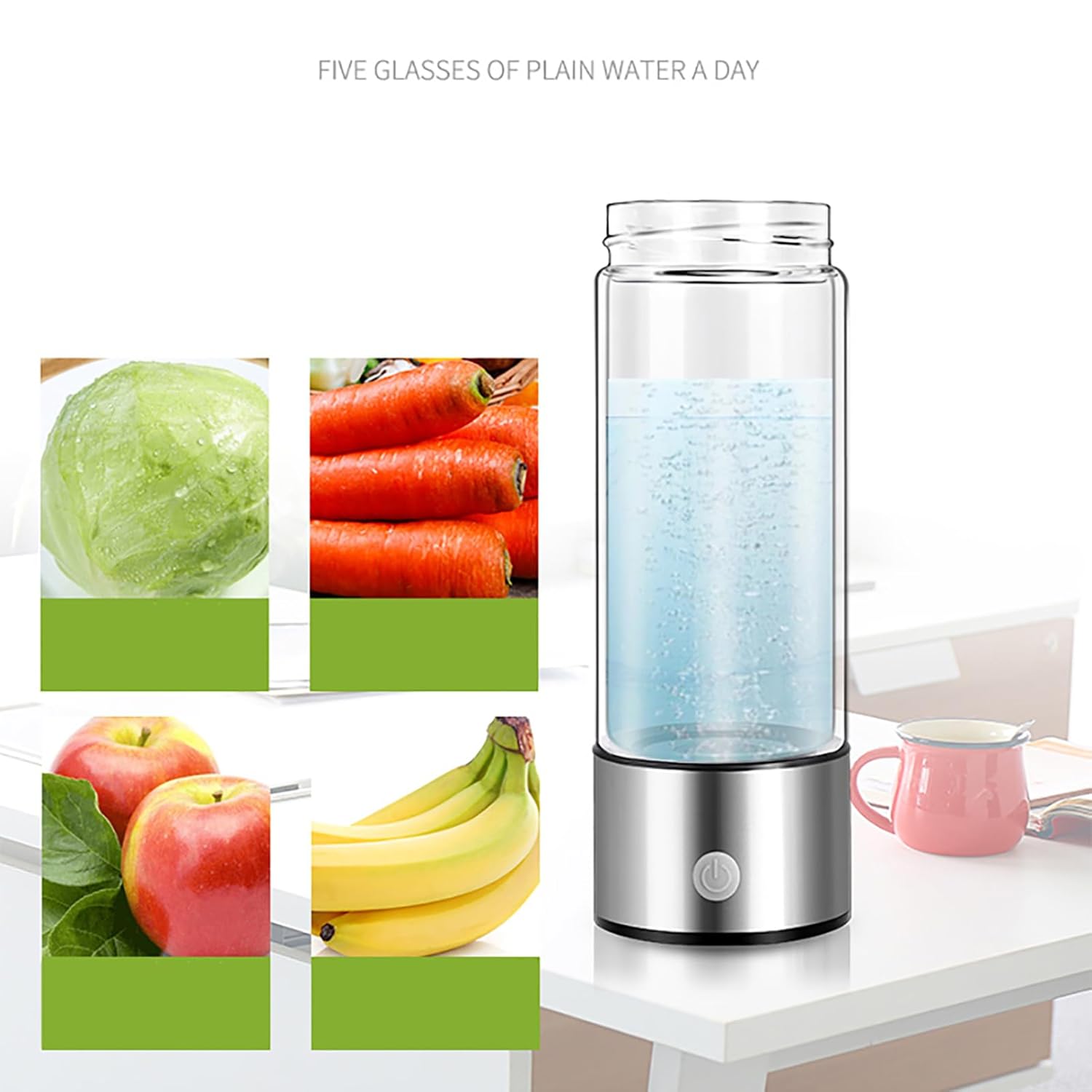 Describe:1. This hydrogen-rich water bottle uses advanced electrolysis technology to convert ordinary drinking water into hydrogen-rich water, which is rich in antioxidants and is beneficial to your overall health. Hydrogen-rich water can reduce oxidative stress, promote a more balanced body, enhance metabolism, and improve sleep quality.2. This bottle is made of high borosilicate glass and nanoscale titanium platinum material to ensure a long service life and high hydrogen concentration, providing you with the best quality water every time. The bottom of the bottle features EVE padding,which provides stability and a non-slip grip.3. Whether you are in the office, traveling or exercising, this bottle can be conveniently used throughout the day to reduce physical fatigue.4. In addition, this hydrogen-rich water bottle is also an excellent gift for family and friends. Not only is it a great investment, it can also bring health and happiness to your loved ones. Whether it's a birthday, holiday or other special occasion,this hydrogen-rich water bottle is a perfect choice.Item Name: Water CupMaterial: High Borosilicate GlassPower Supply: USB ChargingBattery Capacity: 1000mAhWater Cup Capacity: 420MLFeatures: Rechargeable, Rich in Antioxidants, Improve Muscle SorenessSize Details:L: 7cm/2.76", W: 7cm/2.76", H: 20.5cm/8.07" (Approx.)Notes:Due to the light and screen setting difference, the item's color may be slightly different from the pictures.Please allow slight dimension difference due to different manual measurement.Package Includes:1 x Water Cup1 x USB Cable