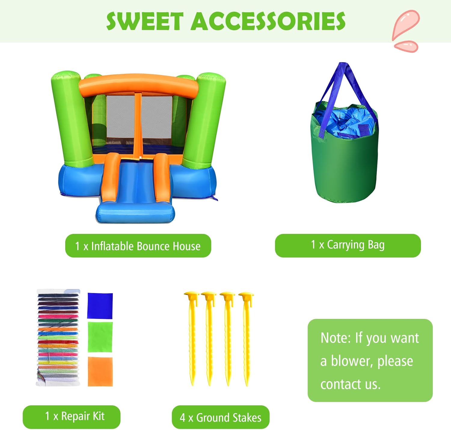 Features:Made of brightly colored, scratch-resistant 420D Oxford Cloth and PVCVarious safety measures such as high walls, mesh panels and padded slideHaving a sturdy base, an arched doorway and four splendid turretsEnough jumping area for 3 kids with a total weight of 300 lbsPlenty of room for kids to jump, leap, hop, skip and tumble around insideEasily inflate and deflate in minutes, and folds into a carrying bag after deflationSuitable for the backyard, garage and garden for indoor & outdoor activitiesSpecifications:Color: MulticolorMaterial: 420D Oxford Cloth, PVCOverall Dimension: 98.5” x 77.5” x 56.5” (L x W x H)Net Weight: 15 lbsWeight Capacity of Inflatable Part: 200 lbsIndividual Weight Limit: 100 lbsRecommended Age: 3-10 years oldRecommended Blower: 480W(not included)Package Includes:1 x Bounce House1 x Carrying Bag1 x Repair Kit4 x Ground Stakes1 x User Guide