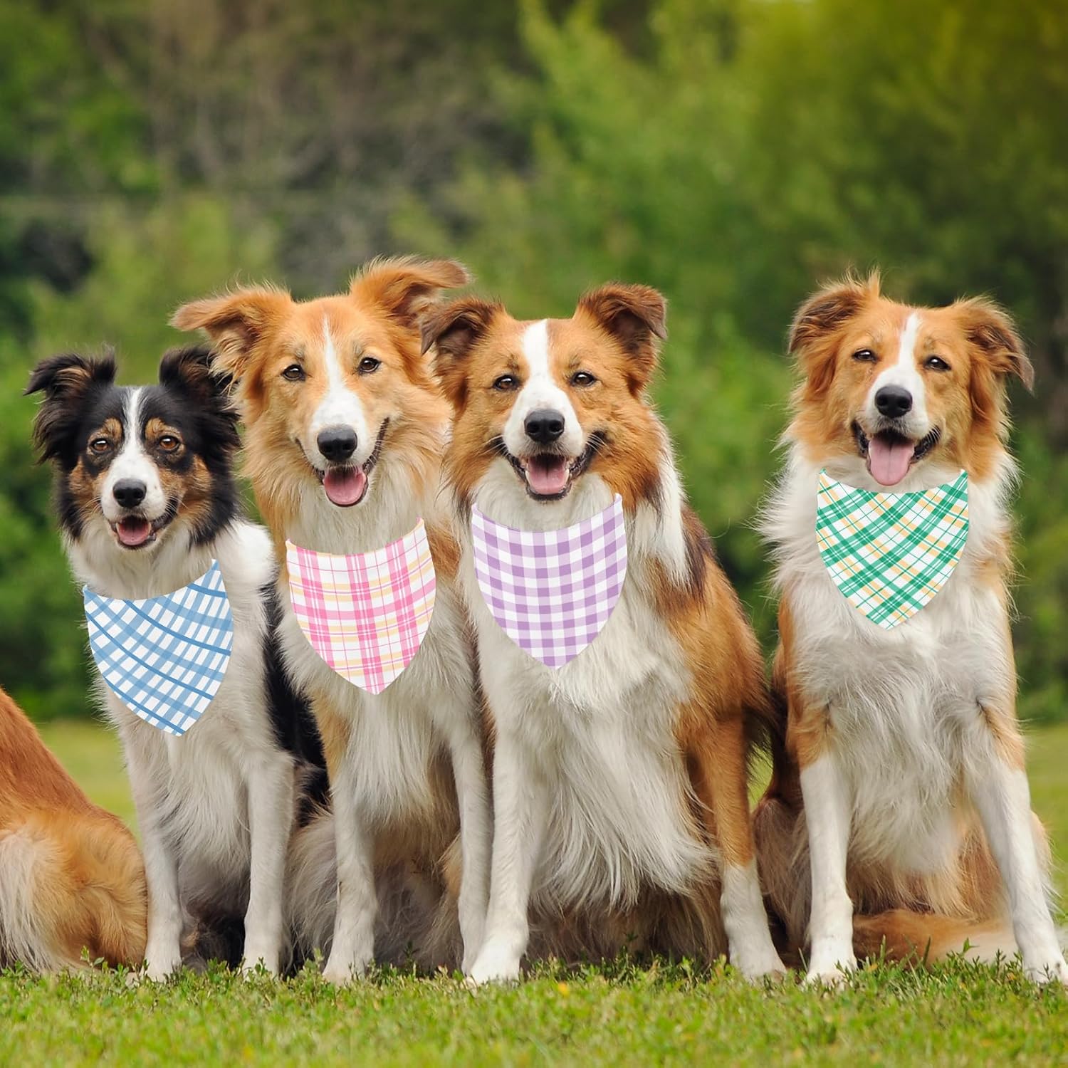 Features: Delicate design: The dog bandana are with pastel plaid designs, exquisite and eye-catching, suitable for dogs daily dressing and party decoration. Suitable occasions: Breathable and sturdy, ideal for pets party decorative dress, everyday wear, pet party and daily photo shot, also can be given to your family's and friends' pets. Specifications: Material: terylene Size: 15.7 x 15.7 x 22.4 inch Package Includes: 60 x Dog Bandana