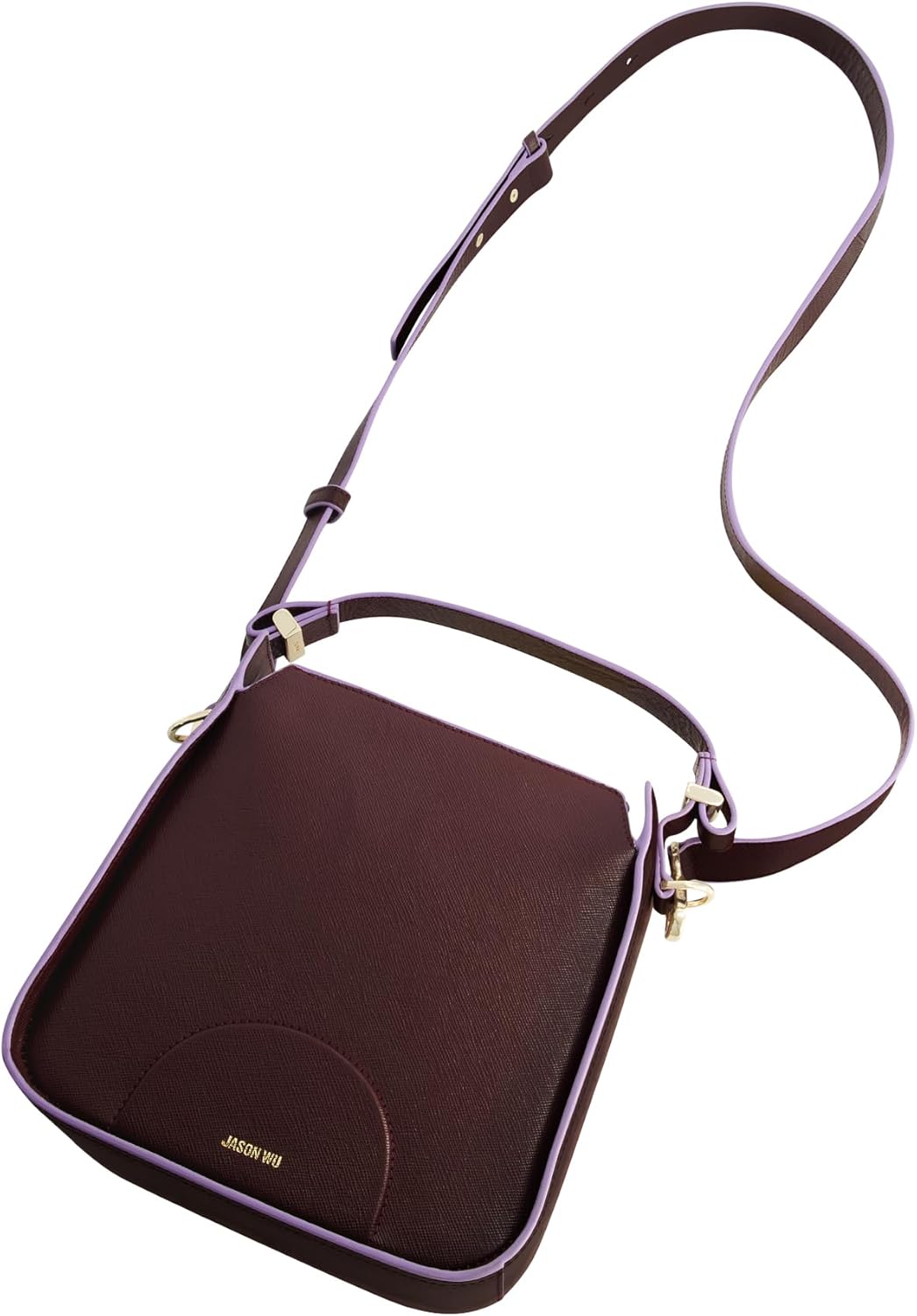 Add a bold yet elegant touch to your wardrobe with our Jason Wu Elegant Crossbody Bag, perfect for both daily use and special occasions. This versatile bag features a rich burgundy leather exterior accented by soft lavender edges, creating a striking and sophisticated contrast. The gold Jason Wu logo on the front and sleek gold hardware add a luxurious touch to this timeless design. Compact and functional, it includes an adjustable shoulder strap with a drop from 20 to 23 inches, making it ideal for carrying essentials like your phone, wallet, keys, and small accessories without the bulk of a larger bag. Crafted from durable cow leather with a polyester lining, this lightweight bag ensures comfort and reliability for everyday wear. Officially licensed Jason Wu merchandise, guaranteeing premium craftsmanship. Dimensions: 8 H x 8 W x 4 D inches.