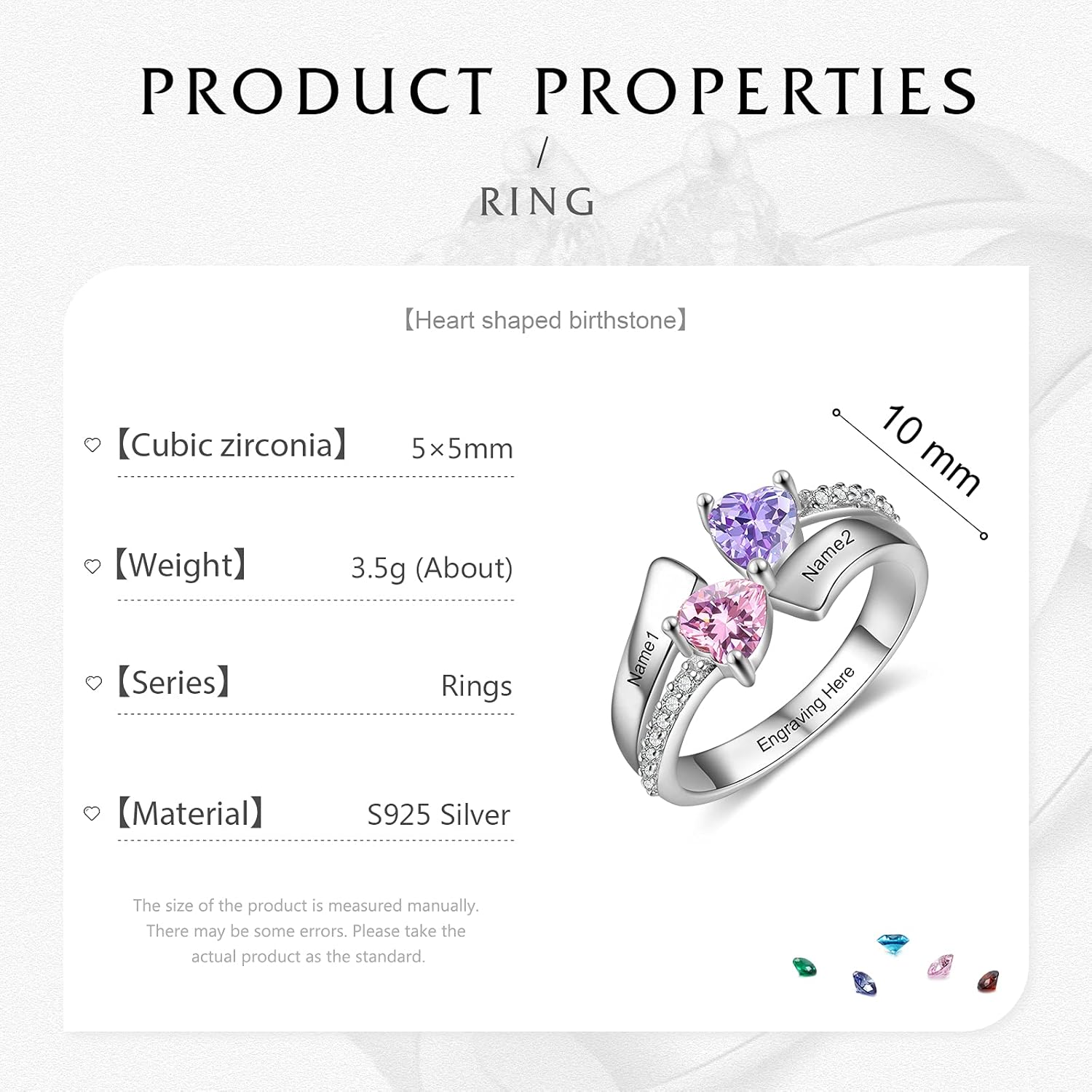 This personalized birthstone ring is more than jewelry—it’s a keepsake made to hold the people you love close. Designed with two heart-shaped stones, each can be customized with a name, while the inside of the band offers space for a secret message, date, or meaningful words. The double-heart design symbolizes two lives intertwined, making it a perfect way to honor love, family, or a special relationship. Crafted in sterling silver and accented with cubic zirconia, this ring blends elegance with lasting quality. Whether it’s a gift for mom, wife, or her, it’s a heartfelt piece she can wear every day as a reminder of the bond you share.