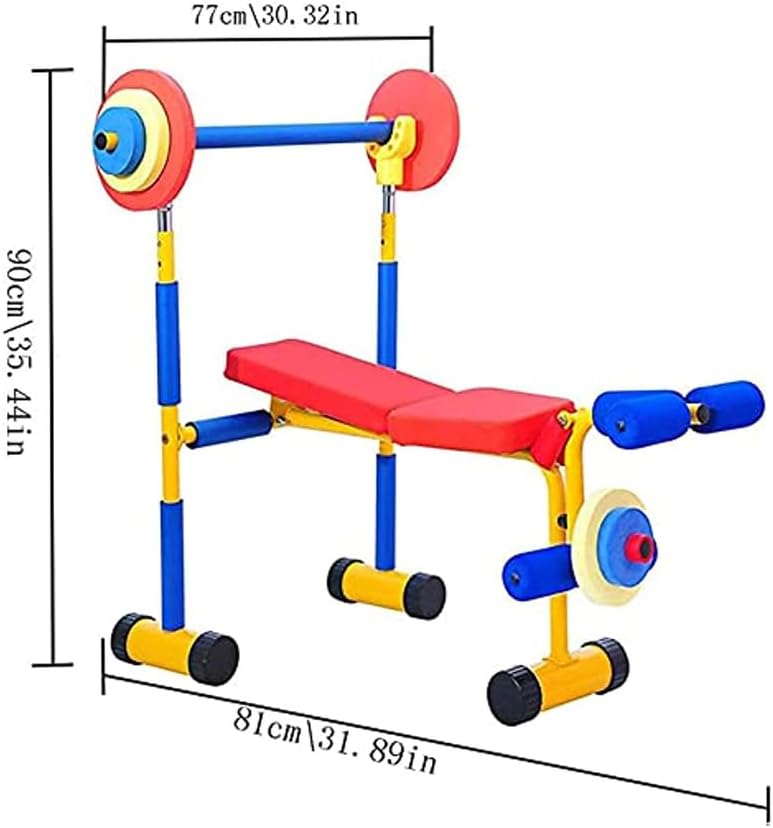 product description:1. The latest children's innovative products. This is a wonderful way for our children to have fun while enjoying the additional benefits of safe and healthy activities.2. This weight bench provides three different exercises: bench press, leg, weight lifting, kid weight bench set wrap all exposed frames on sports equipment in soft foam. This provides cushioning while your child does leg or bench press exercises.3. Not only is this toy barbell a fun way to introduce your child to proper exercise and weightlifting forms and routines, This will inspire their mobile and active lifestyles now and in the future, which will benefit them throughout their lives.4. kids weight bench made with superior quality materials and are rigorously built for quality, leading to a toy unmatched in quality and durability.5. but it also teaches them how muscles move and how the body works as they pretend to benchpress or powerlifting Perfect way to slowly develop kids’ muscles.children's weight bedSize: 90*81*77cmWeight: 6.7 kgRecommended age: 3-8 years oldMaximum Weight: 100 lbsNote: Kids should play under adult supervision.