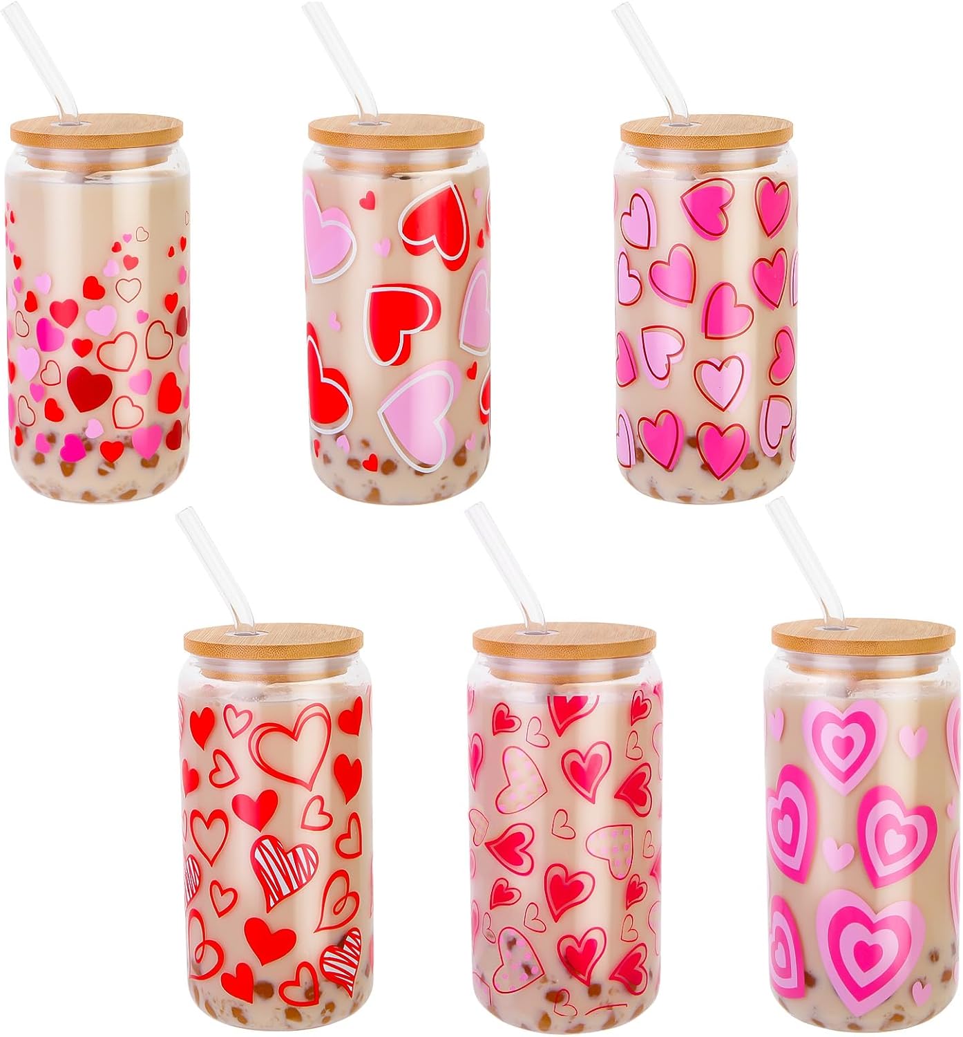 Can glass set:6 beer glass with 6 glass straws, 6 bamboo lids and 2 straw brushes in the package.The straw brush helps you clean the inside of the drinking straw well. The lid helps protect against spills whether you’re at home, by the pool, or on the go Valentine's design:The whole looking of this glassware is printed mixed hearts, cupid's arrow, key print pattern, "Love" ,so vivid color and clear pattern, make Valentine's party fun by using these Valentine's cups,designed to replicate a beer can to capture rich foam and aroma of a delicious soda or beer, and impact the drinking experience, will definitely make your Valentine's Day bold and unique Safety Material: Our glass bottles are leadless, non-toxic, BPA-free, BPS-free, phthalate-free, cadmium-free and composed of 100% high-density borosilicate. It's suitable for warm (about 70-80 degrees Celsius) and cold beverages. The unique bottle mouth design retains the aroma of the drink itself and preserves the original flavor of the drink to a greater extent Size: measuring 2.8" Wx5.9" H, this cup glass fits in the cup holders. Each glass measures 5.3” in height and 3 with width, holding liquid of 16oz. The length of straw is 8.5” meaning you still have proper length left even insert in the glass fully. Classic figures make this glassware a unique one-size-fits-most option for a variety of beverages Widely applications:Our high-quality glass cups will certainly be the perfect party cups for Valentine's party, anniversary, wedding, dinner party, birthday, bride shower, etc.. ,perfect for coffee, wine, tea, cocktails, smoothies, ice coffee, champagne, beer, ice cream and more,come together to feel the Valentine's minute,enjoy the wonderful experience of the Valentine's party together