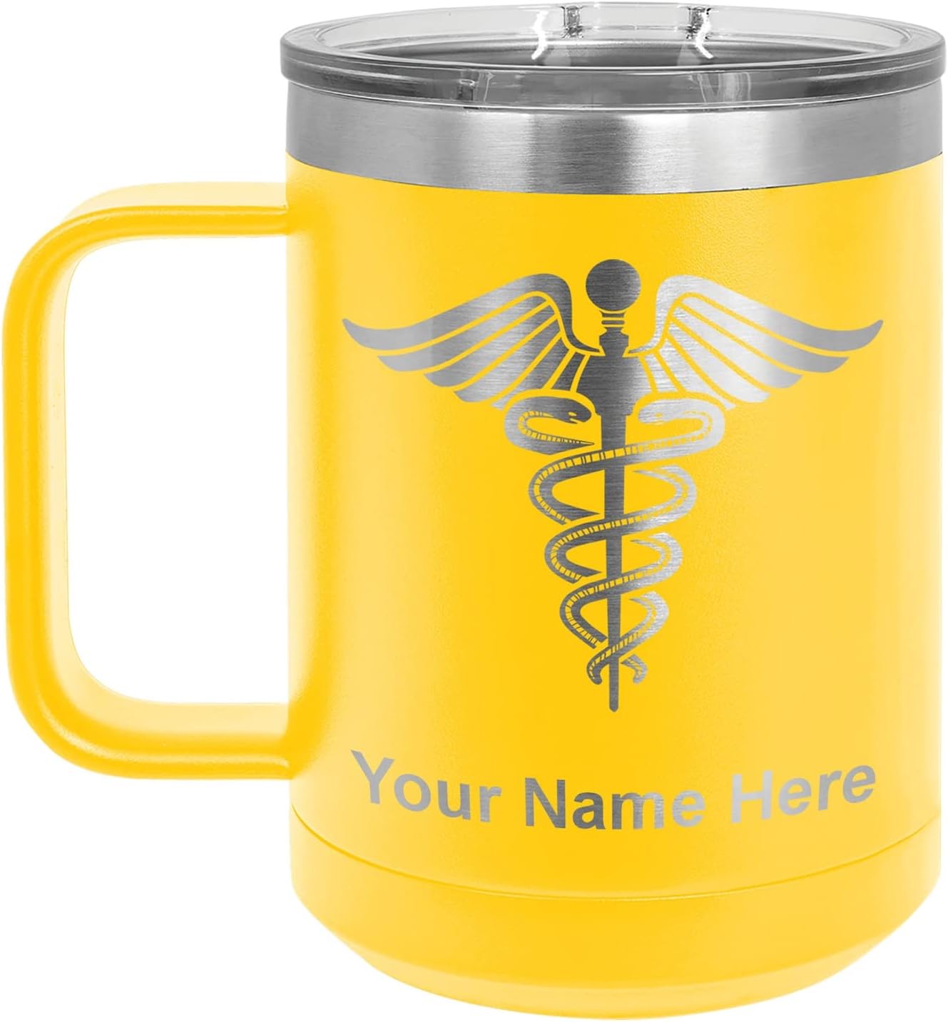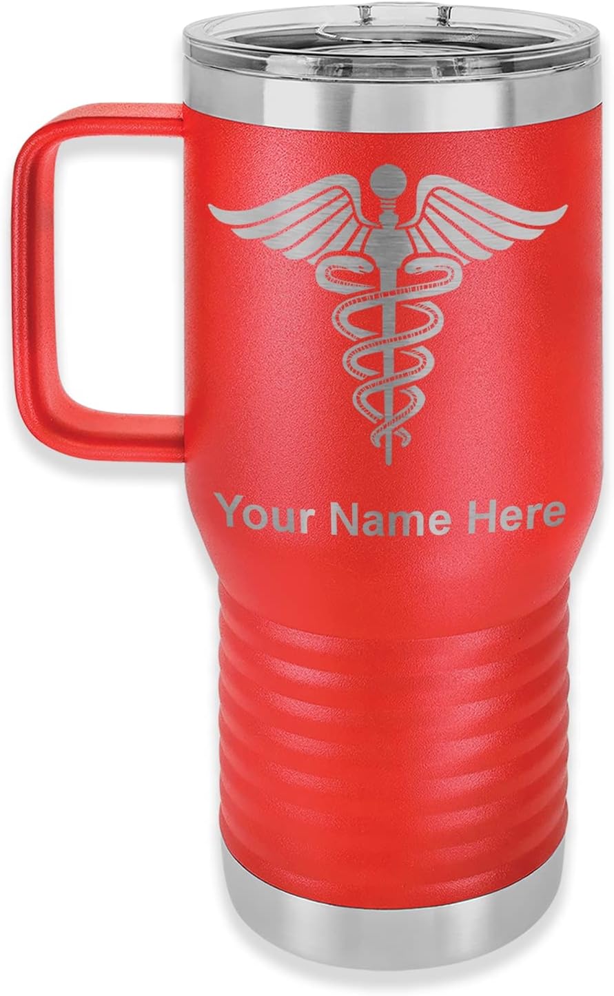 LaserGram 40 ounce Travel Mug with Handle that is laser engraved with the image that you see in the photo. Your own personalized text will be laser engraved below the image. Features double-walled stainless steel vacuum insulation with a clear lid. Click the "Customize Now" button to begin customizing your mug.