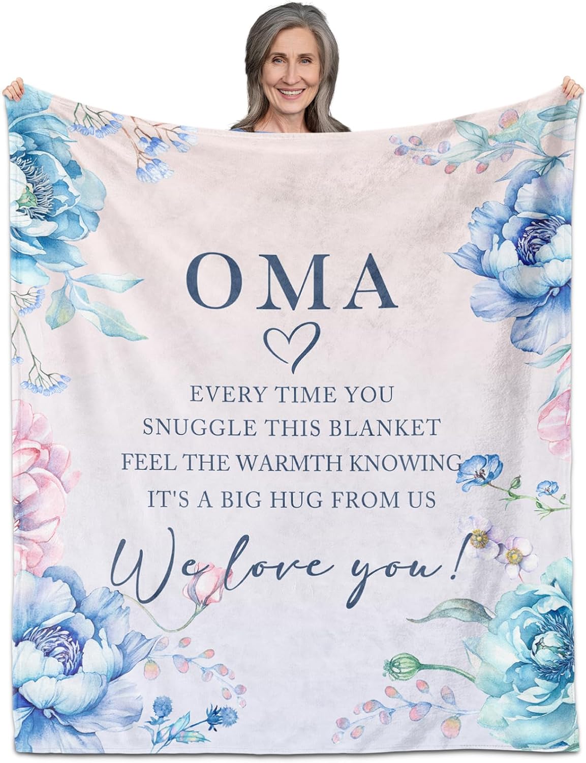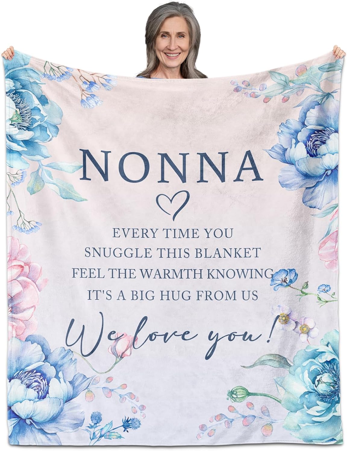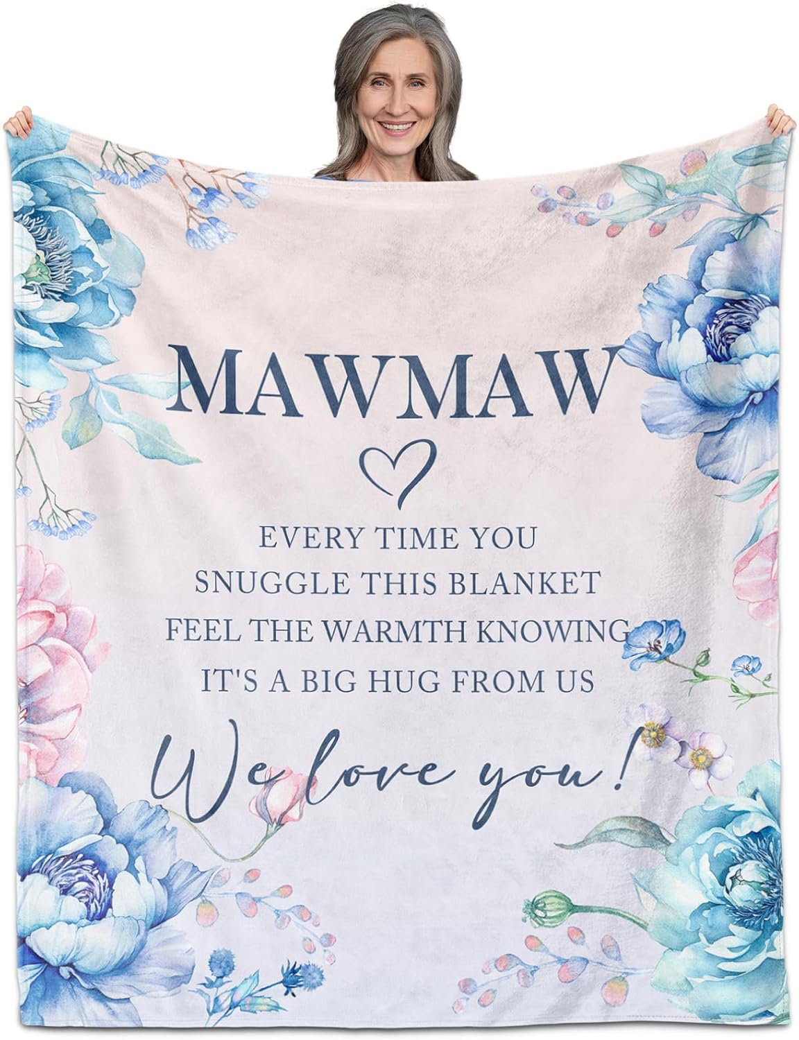 Give Your Beloved Meme a Heartfelt Embrace with This Beautifully Designed 60" X 50" Blanket. The Soft, Cozy Throw Features an Elegant Watercolor Floral Design in Soothing Blues and Pinks, Perfectly Framing a Touching Message of Love. The Delicate Botanical Pattern Includes Gentle Roses, Tender Buds, And Graceful Leaves That Create a Serene and Feminine Aesthetic. This Thoughtful Gift Serves as a Constant Reminder of Your Affection, With Its Heartwarming Message "Every Time You Snuggle This Blanket, Feel the Warmth Knowing It's a Big Hug from Us." Perfect for Birthdays, Mother's Day, Christmas, Or Any Special Occasion When You Want to Show Your Meme Just How Much She Means to You. The Generous Size Makes It Ideal for Curling up with a Good Book or Staying Warm During Evening TV Time. This Meaningful Keepsake Will Bring Comfort and Joy to Any Grandmother, Making Her Feel Loved and Appreciated Every Time She Wraps Herself in Its Warmth