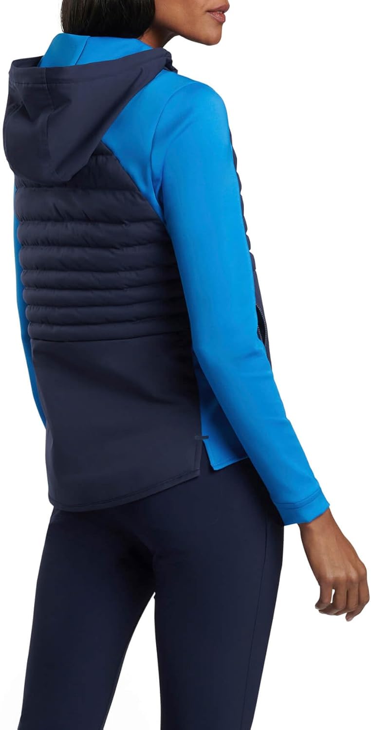 Why not both? That’s the question that inspired the Peter Millar Women's Hooded Merge Half-Zip. A hybrid jacket, this custom ½ zip blends the warmth and weather protection of a quilted chest and back shell with the lightweight comfort and mobility of spandex blend side and shoulder panels. It’s Peter Millar apparel that everyone will appreciate, whether on the green or on the go. Shell, Exterior Hood: 100% Polyester With Pu Membrane Side Panels, Upper Shoulder Panels, Interior Hood: 88% Polyester 12% spandex Fill: 100% Recycled Polyester Four-way stretch and wicking Wind-and-water resistance Roomier fit for layering Machine wash cold with like colors; lay flat to dry Imported