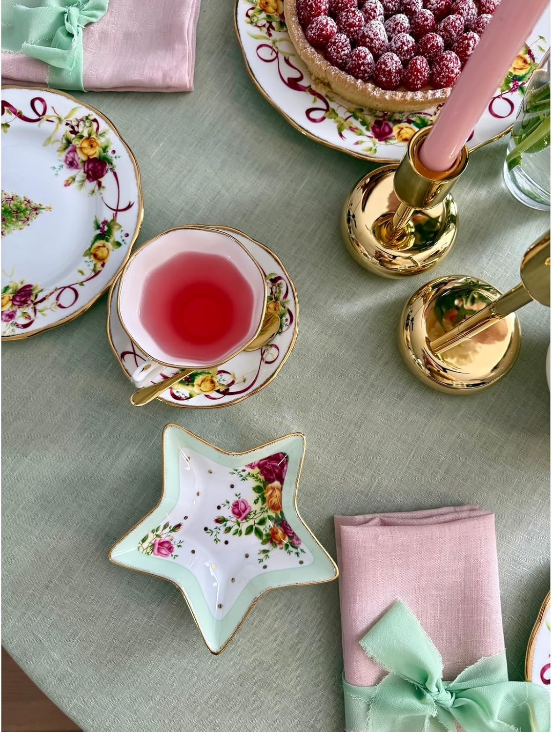 Royal albert old country roses Christmas tree collection adds a seasonal touch and warmth to any table. This Christmas tree salad plate features a beautifully decorated Christmas tree outlined with a holiday themed old country roses design and iconic gold rim.