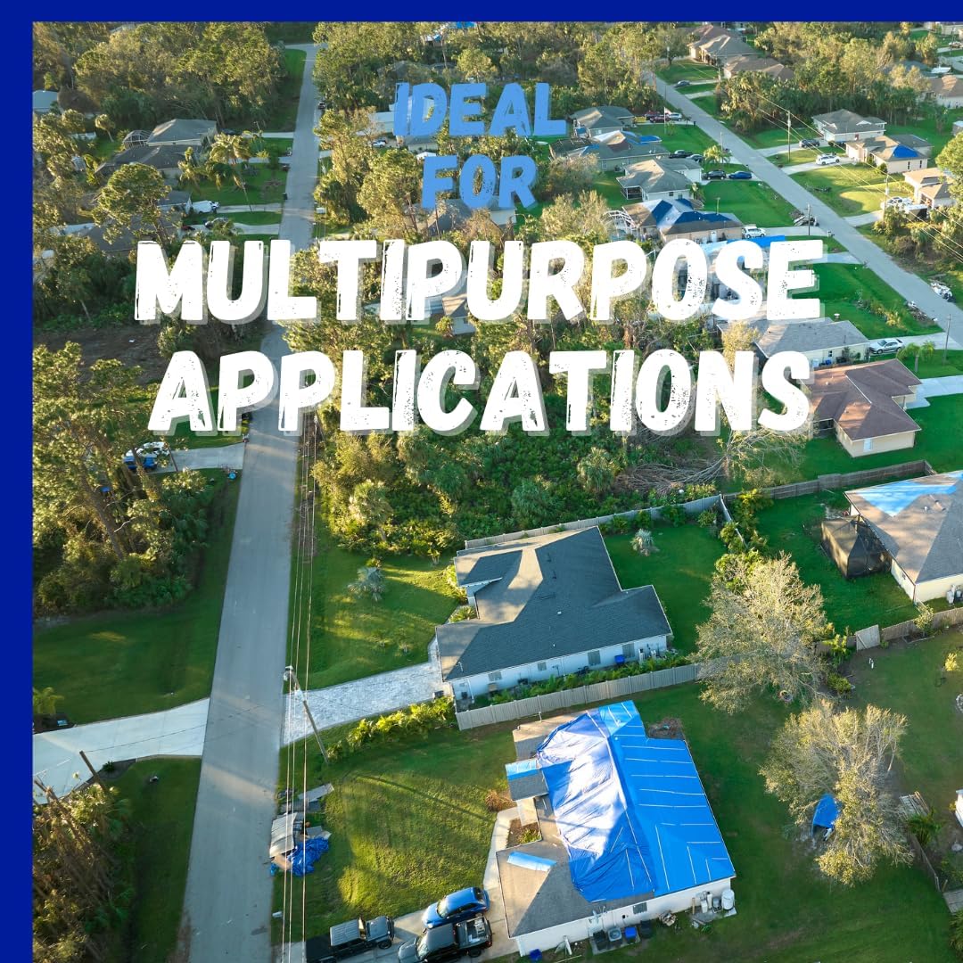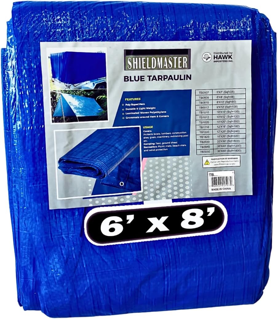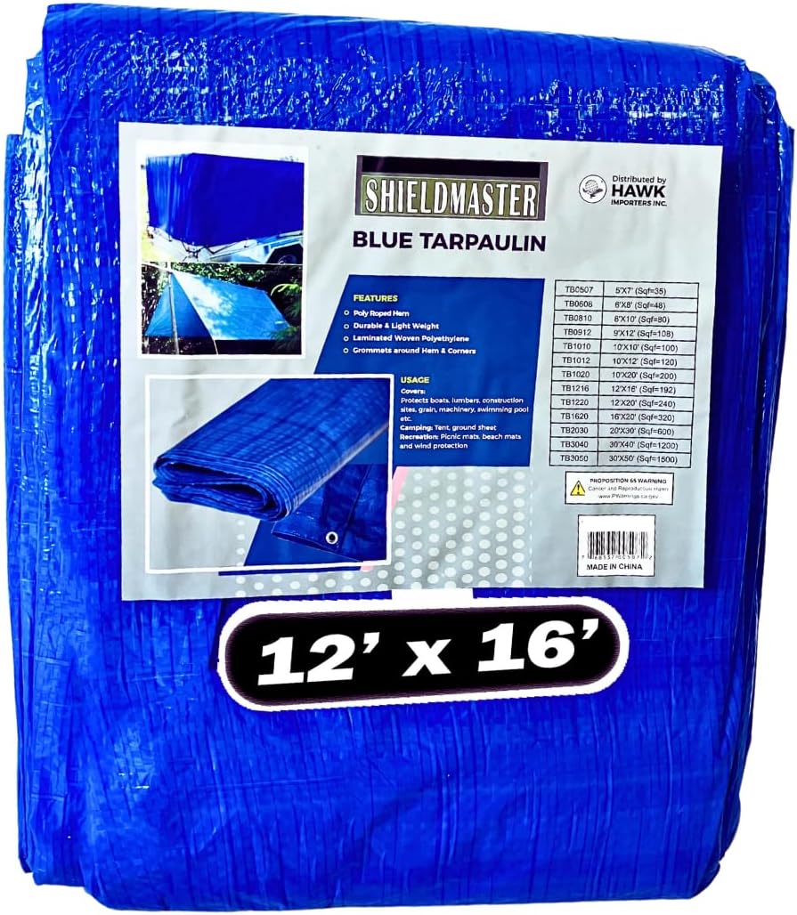 SHIELDMASTER 20' X 20' Blue Poly Tarp Cover | 5 Mil Thickness | 100% Waterproof, UV Resistant, Rip and Tear Proof Tarpaulin | Includes Grommets | Great for Outdoors & Protecting ValuablesTIGHTLY WOVEN FABRIC: The high-quality build of this protective tarp has a 5 mil thickness, 2 oz per square yard, and a 8 x 8 weave count. This has the strength and durability you need.ALL WEATHER PROTECTION: Built to withstand rain, shine, snow or wind this heavy tarp can handle it all! It is 100% waterproof, UV resistance, weatherproof, and can withstand all the elements of the outdoors while protecting your valuables.TIE IT DOWN EASILY: Rustproof metal grommets spaced every 36 inches or 3 feet and at each corner allow this poly tarp to be tied down and secured simply.MULTIPLE SIZES: Our tarps come in a variety of sizes ranging from 5 x 7 ft to 30 x 40 ft making SHIELDMASTER a one stop shop for all tarp needs.MULTIPURPOSE USE: These tarps are used to cover/shelter boats, truck, cars, motor vehicles, industrial or farm equipment, outdoor patio furniture, barbecue grills, backyard pool, wood piles, campers for ultimate protection. They can also be used as an emergency roof patch material or building material for homeowners, construction workers/sites. They can be used as a drop cloth while painting or polishing. Can be used outdoors for camping, hunting, turn it into a canopy or to create a tent fly.
