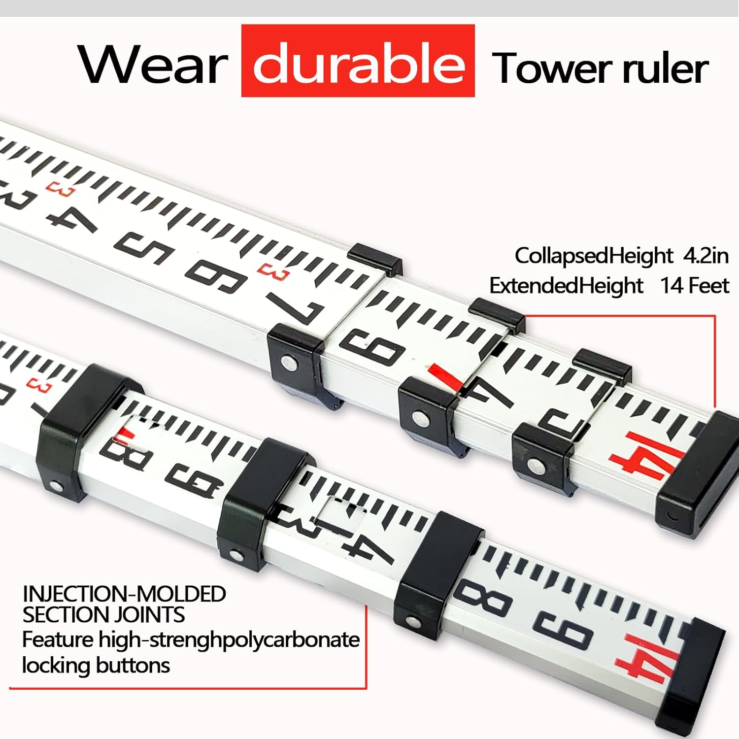 Land Engineering Ruler: Telescopic Rod Ruler There are scales on both sides, the front is marked in feet/tenths, the back is marked in feet/inches, and it comes with a bubble level.