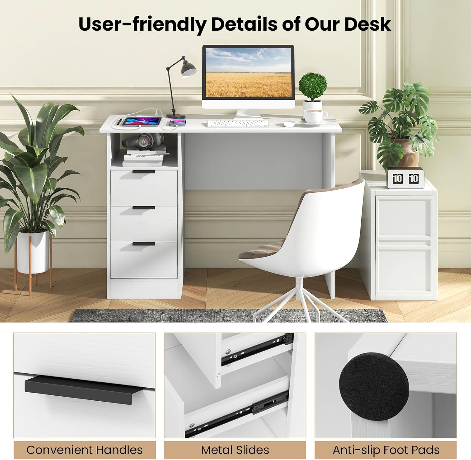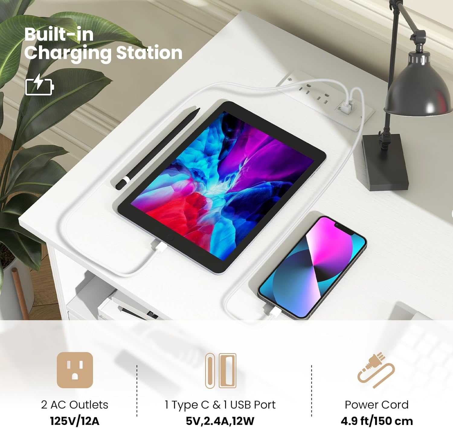 DescriptionTransform your workspace into a powerhouse of productivity and style with our modern writing desk! Effortlessly charge all your gadgets with built-in AC, USB, and Type-C ports. Stash away clutter in sleek storage drawers, while an open compartment awaits your essentials. Built to last, this sturdy workstation can handle up to 300 pounds with ease. Each drawer glides open with a whisper thanks to smooth metal slides, and non-slip foot pads keep your floors pristine. Perfectly adaptable, it’s not just a desk - it’s your next home office hero, a student’s best study buddy, or even a chic vanity. Elevate your space with this multifunctional masterpiece now!FeatureAdvanced charging station with 2 AC outlets, a USB port and Type-C portSpacious tabletop, 3 drawers and an open compartment for large storage spaceSturdy construction supporting up to 300 lbs of weightConvenient handles on the drawers for easy accessSmooth metal slides for seamless drawer operationNon-slip foot pads to protect your floorsStylish and modern design for a contemporary workspace4.9 ft power cord for easy connection to power supplySuitable for domestic and commercial use, can be used in home or officeSpecificationColor: WhiteMaterial: Engineered WoodOverall Dimensions: 42.5” x 19” x 30” (L x W x H)Dimensions of Open Compartment: 12” x 18” x 6” (L x W x H)Interior of Drawer: 11” x 10” x 2.5” (L x W x H)AC Outlets: 125V/12AUSB Ports & Type-C: 5V, 2.4A, 12WPower Cord Length: 4.9 ftWidth of Legroom: 27”Total Weight Capacity: 300 lbsWeight Capacity of Tabletop: 165 lbsNet Weight: 56.5 lbsPackage Includes:1 x Computer Desk1 x Instruction