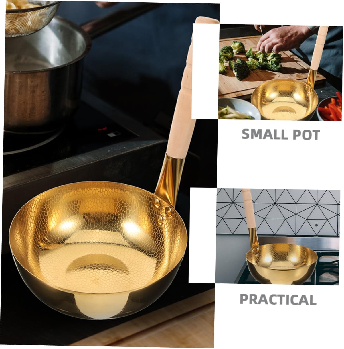 Package List 1 x Cooking Pot Characteristics - Color: Golden ramen pot with lid - Size: 30.50X24.00X24.00cm/11.99X9.43X9.43in noodles pot - Material: Stainless steel, wood small pasta pot - Versatile cooking tool: perfect for boiling noodles, simmering soups, and making porridge easily Rice Noodles Pot. - Capacity: 2L stainless steel soup pot - It can not only withstand high temperatures, but also can transfer heat to cook food in a short time instant noodle pot. - Excellent workmanship, give maximum attention to every detail to give it a simple look noodle pot. - With good texture, perfect details, this small cooking pot can bring you a good experience korean ramen noodle pot. noodle pots - Simple and convenient to use, not easy to break or deform, reusable and can be applied for longtime soup pan.Goods Descriptionsoup pan It is compact and lightweight, making it convenient to carry and store.Rice Noodles Pot With its compact size, this cooking pot is ideal for small families or individuals.porridge pot The hammered texture on the bottom not only adds a unique aesthetic appeal but also prevents food from sticking, making cleaning a breeze