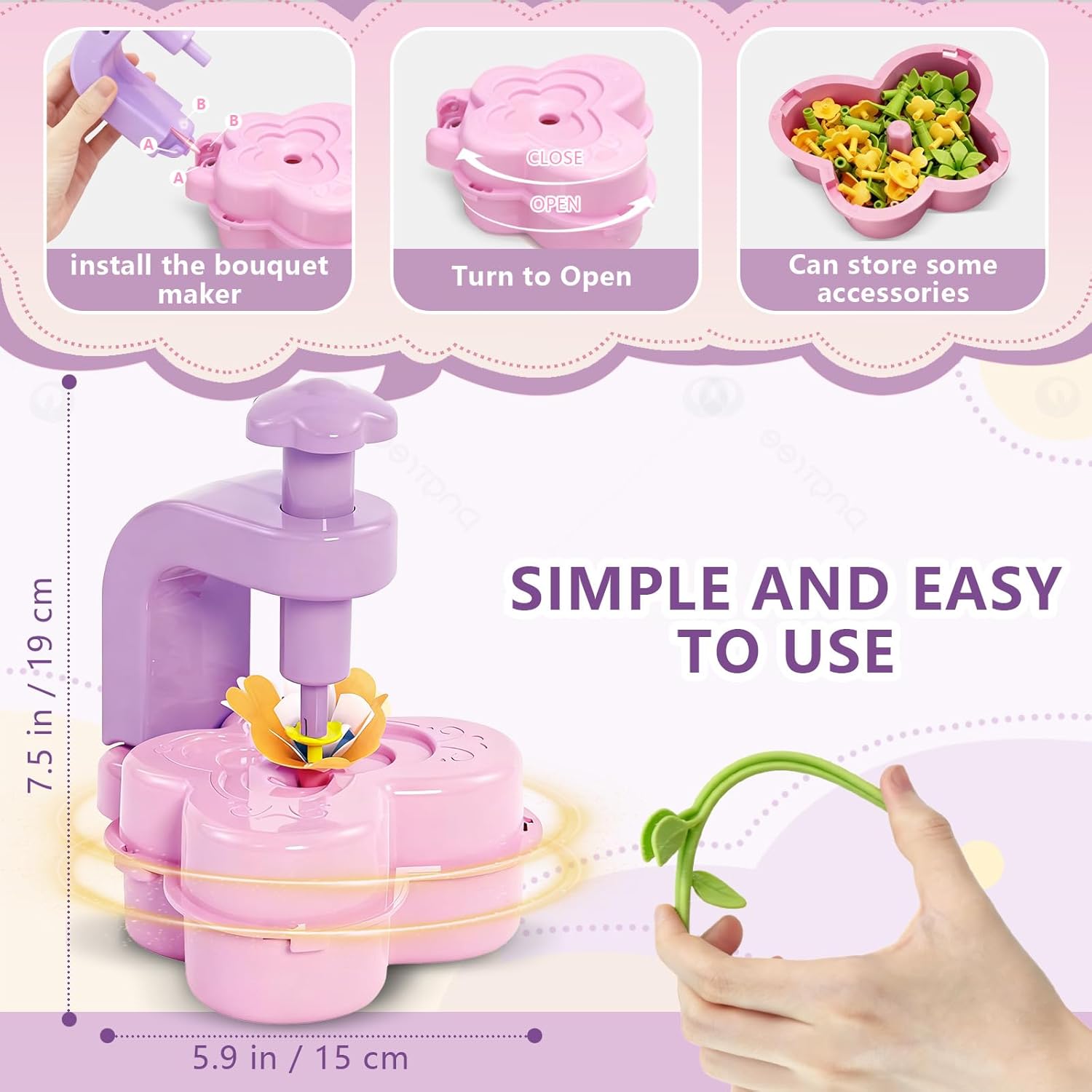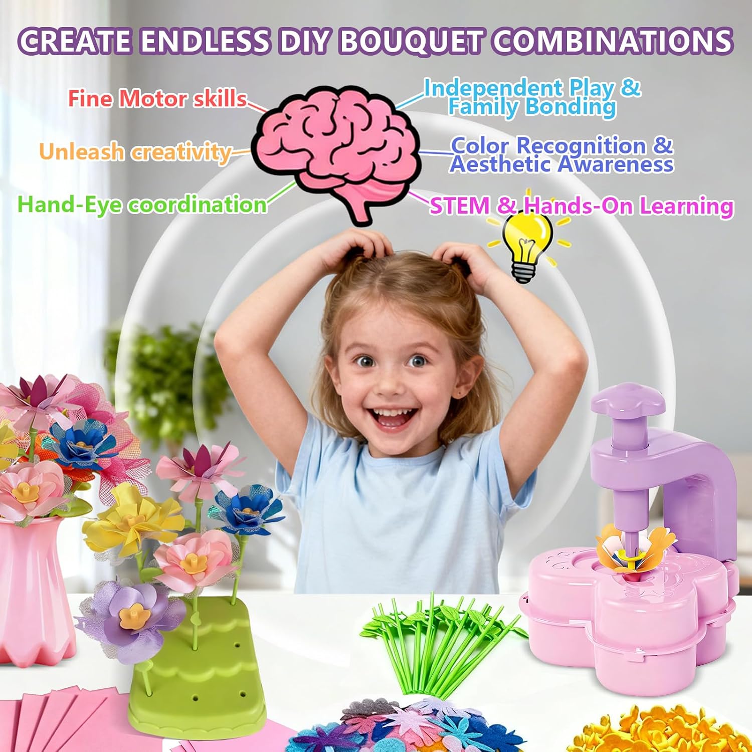 Unleash a Garden of Creativity and Learning! Give your child the joy of creating something beautiful with their own hands! Our Flower Making Kit is the perfect blend of creative fun and educational value, designed to captivate kids for hours. Watch their confidence bloom as they master the simple press-and-create mechanism, designing stunning bouquets to keep, decorate their room, or give as the most heartfelt gift.This isn't just a toy;it's a tool that develops crucial skills like hand-eye coordination, color recognition, and problem-solving, all under the delightful guise of play. Crafted with your child's safety as our top priority, every piece is made from high-quality, non-toxic, and child-safe materials.We've included every accessory needed for endless creativity and easy cleanup. Perfect For: Birthdays, Christmas, Easter Baskets, Summer Camp Activities, Children's Day, and as a unique Mother's Day gift from a child.It's the ideal screen-free activity that kids and parents will love.Order now and watch your child's imagination blossom! Package Includes: 1 x Flower Embossing Machine, 90+ x Fabric Petals, 28 x Flower Cores, 28 x Receptacles, 14 x Long Stems, 14 x Short Stems, 1 x Vases, 2 x Display Bases, 4 x Bouquet Wrapping Papers.